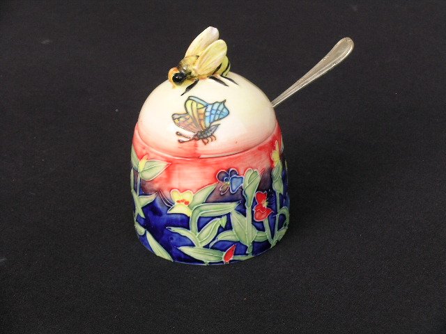 Wyjątkowej urody porcelanowe naczynko na miód - fantastycznie w całości ręcznie zdobione. Faktura kwiatowego motywu i bajkowość kolorów. No i ta pszczoła ! A motyl? Ach! ten motyl ! :) Praktyczna dziurka na łyżeczkę. Sygnowane, angielskie. Na błyszcząco szkliwione. Dekoracja stołu w najlepszym baśniowym wydaniu :) Dół 7; wysokość 10,5 cm. Stan zachowania bardzo dobry minus drobny miękki ubytek prawego pszczelego skrzydełka.zabezpieczony i pomalowany na ecru-biell. - widoczny na zdjęćiach, W zestawie z bardzo ciekawą płaską łyżeczką.