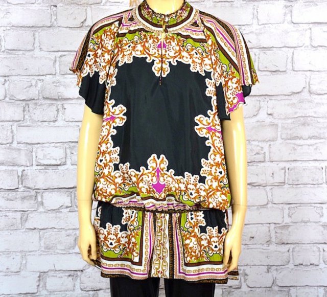 Dłuższa tunika w barokowe wzory z obniżoną linią talii - praktycznie przy linii bioder ( na gumce), pod szyją stójka, tunika ma luźniejszy fason .