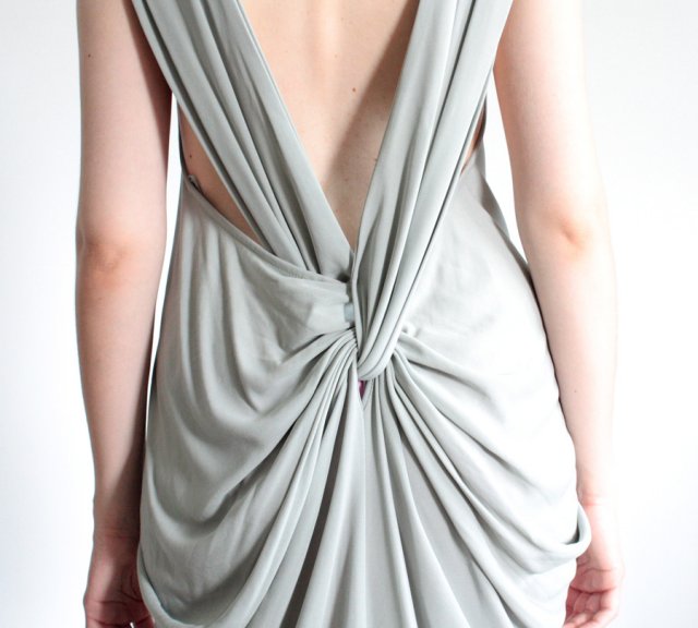 Sukienka o niesamowitym fasonie. Z przodu krótsza, z tyłu dłuższa. Dekolt z tyłu pięknie wykończony misternym węzłem. Materiał jest elastyczny, dopasowuje się do sylwetki.
