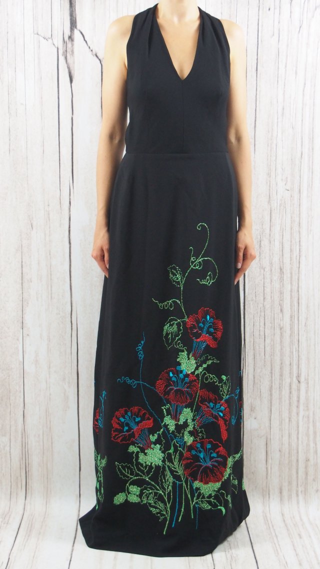 Przepiękna sukienka z lat 70-tych. Z cięższego materiału (pewnie poliester), na podszewce nylonowej. Haftowane maki dodają jej lekkości.