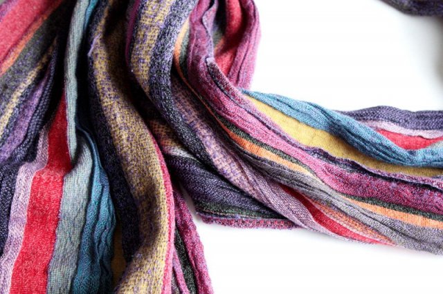 Długi, miękki, niezwykle kolorowy szal wykonany prawdopodobnie z wiskozy.