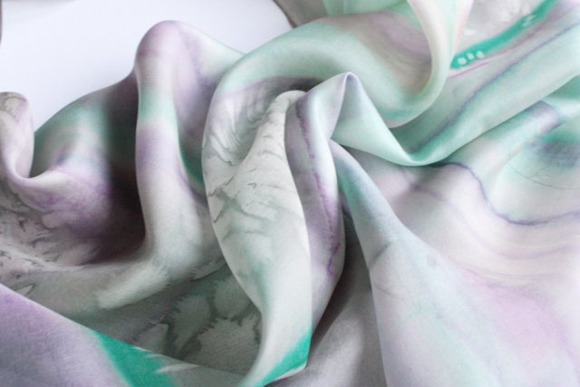 Duża chusta w pastelowe malarskie motywy z delikatnego materiału (prawdopodobnie jedwab naturalny).