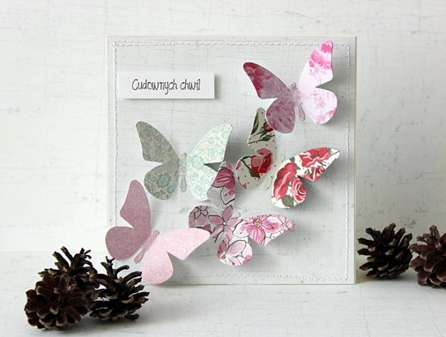 Delikatna, jasnoszara kartka z pięknymi motylkami. Dodatkowo zdobią ja przeszycia maszynowe. Wykonana na kremowej bazie w formacie 15x15 cm. Doskonała na urodziny, imieniny lub bez okazji.