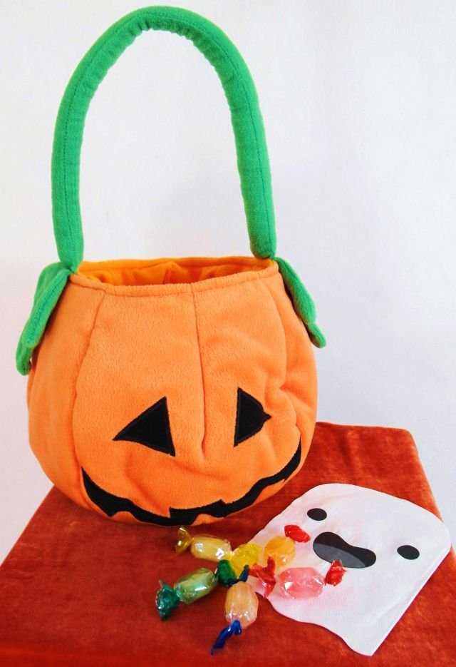 pluszowa torebka w kształcie dyni na halloweenowe słodkie zdobycze.