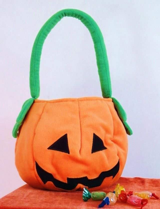 pluszowa torebka w kształcie dyni na halloweenowe słodkie zdobycze.