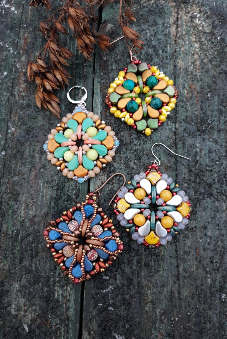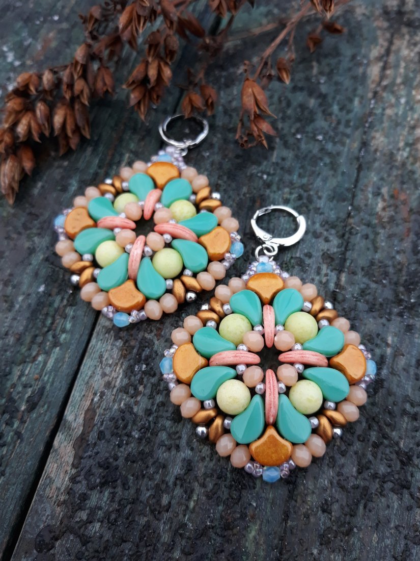 ,,cukierkowe,,to kolorowe ażurowe kolczyki w kształcie kwadratów wykonane ze szklanych koralików i kryształków w różnych odcieniach beżu, różu i złota. Kolczyki zawieszone są na ozdobnych biglach typu kajdanki wykonanych z mosiądzu.