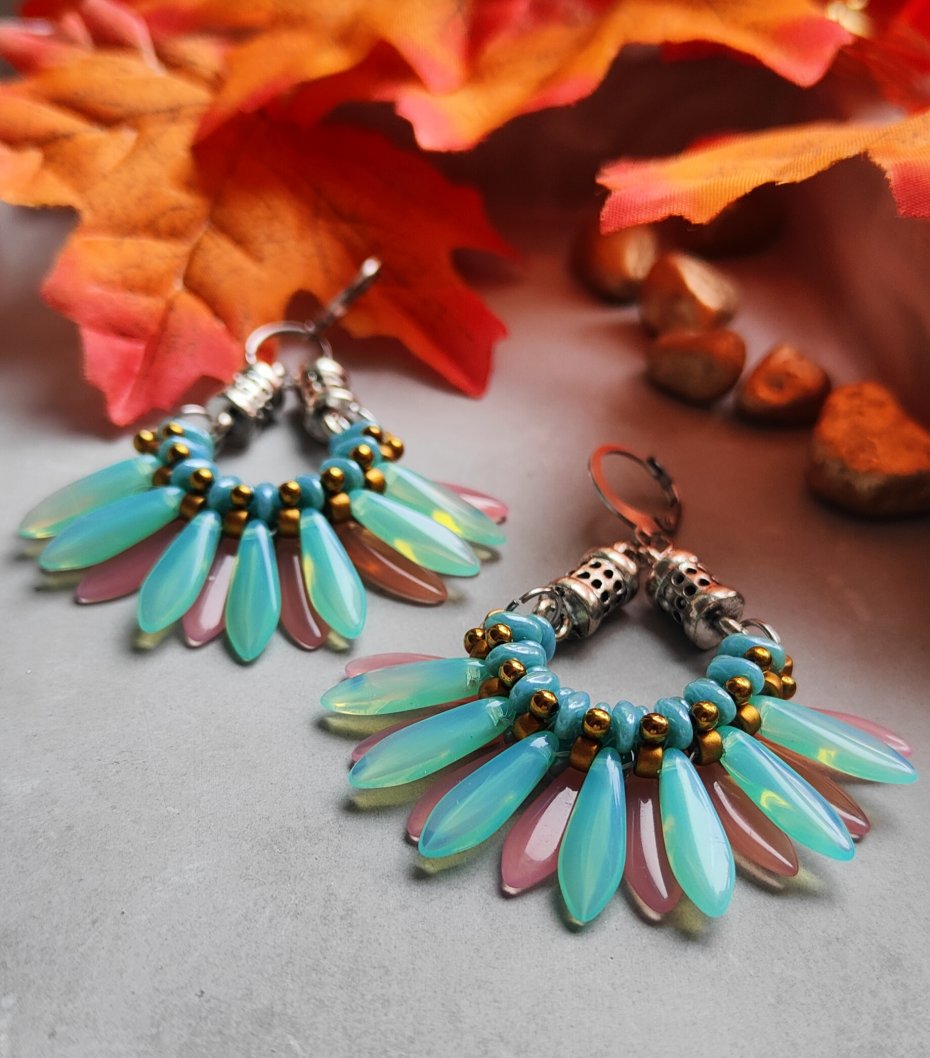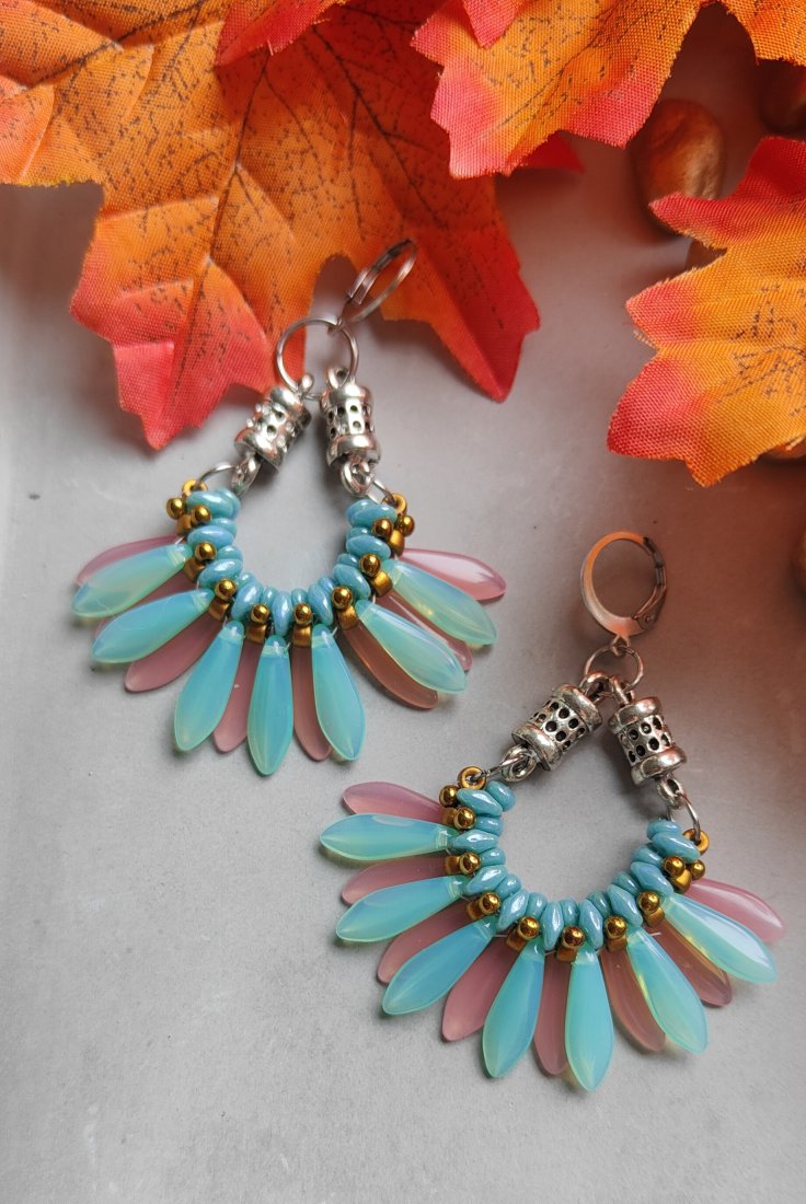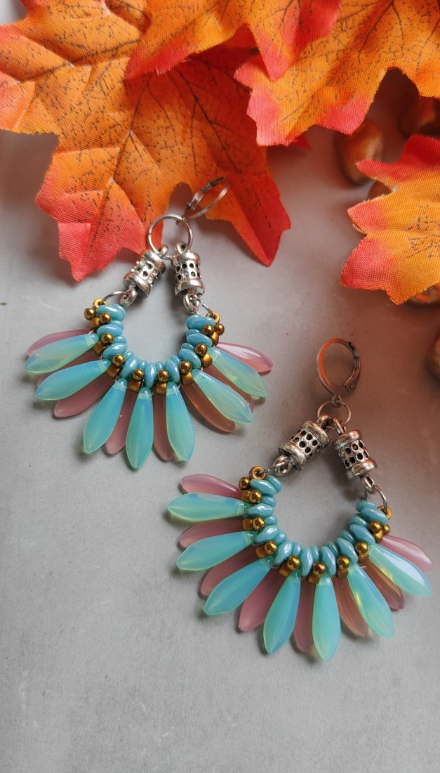 ,,cukierkowe , to kolczyki idealne dla miłośniczek różu. Wykonane one są z koralików w odcieniach różu, błękitni złota, z dodatkiem metalowych elementów w kolorze srebrnym. Kolczyki te zawieszone są na ozdobnych biglach typu kajdanki wykonanych ze stali szlachetnej.