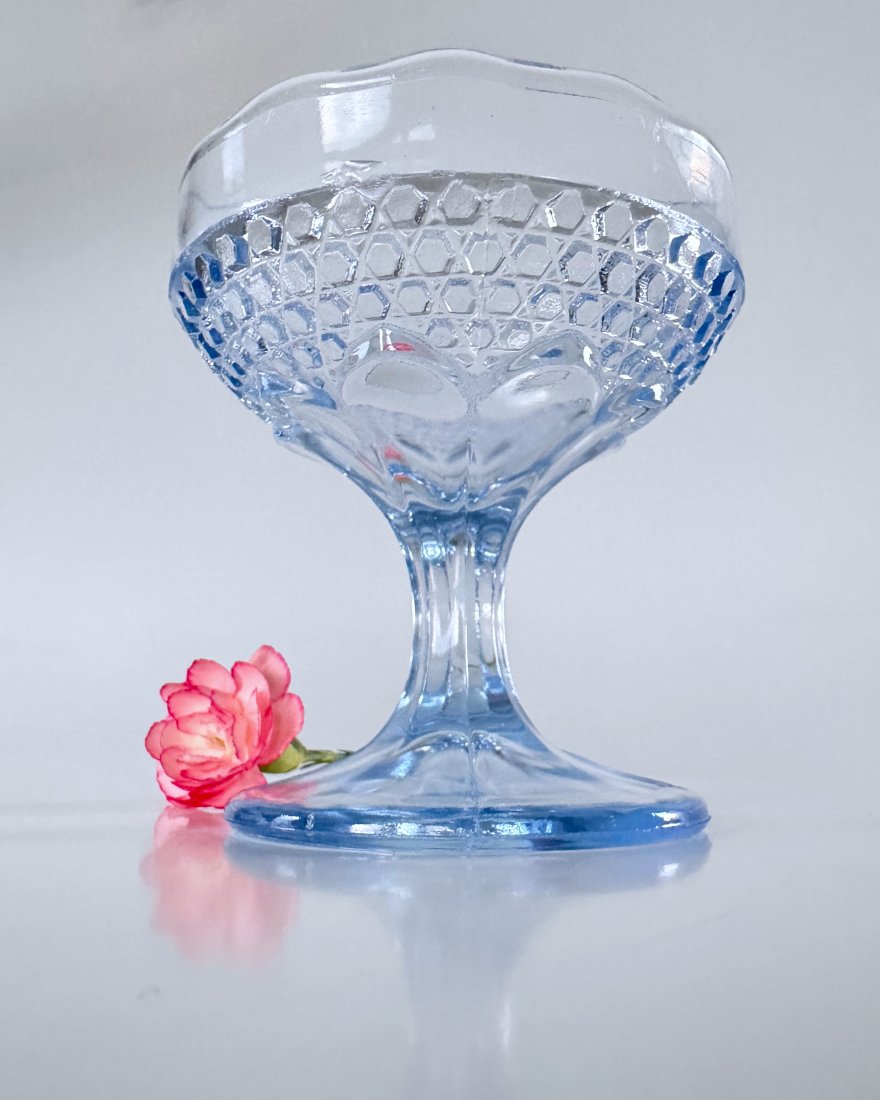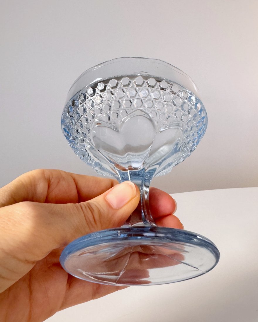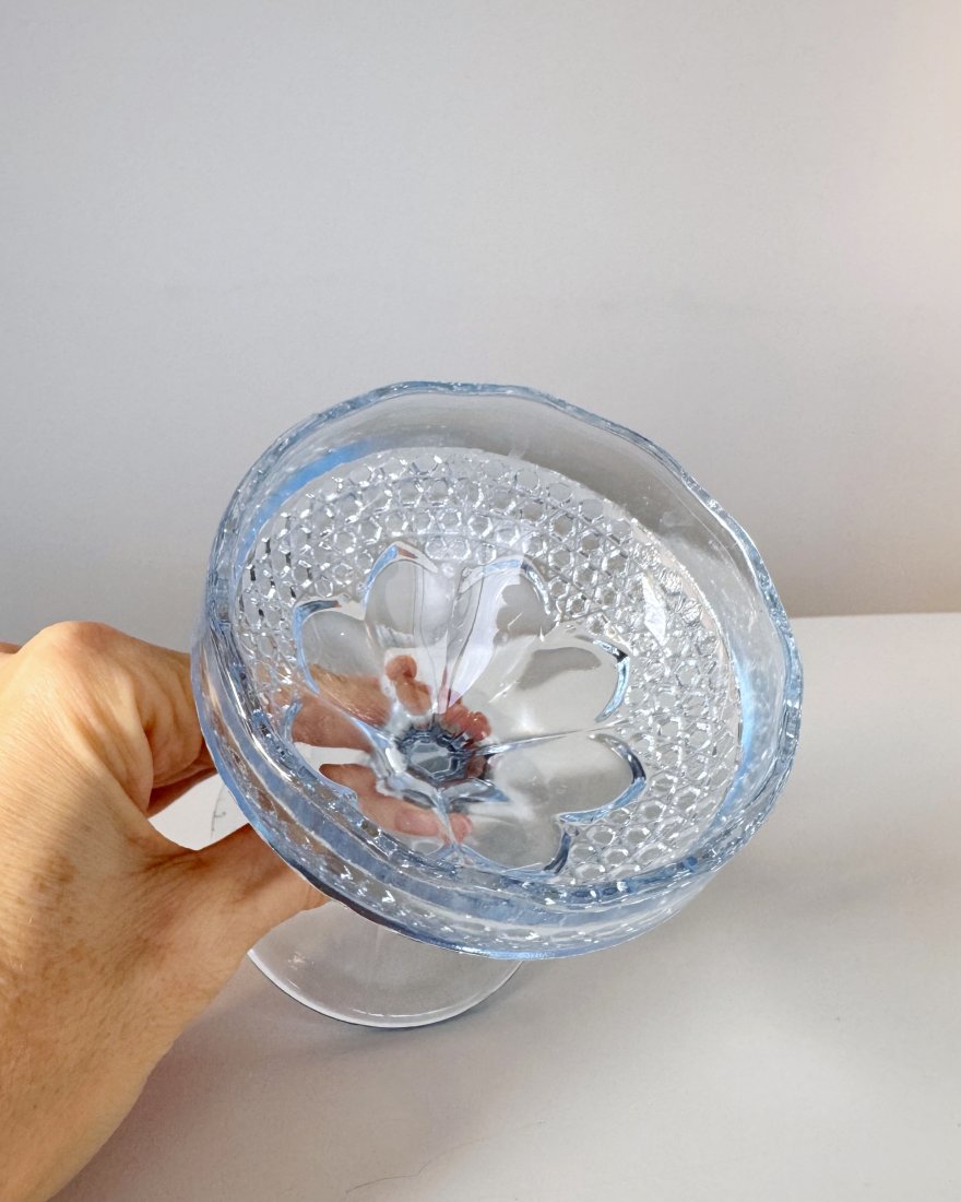 Cukiernica zwana ,kwiatek’ wykonana ze szkła w odcieniu błękitnym w HSG Ząbkowice.