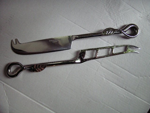 Bardzo oryginalny zestaw sztućców do serwowania potraw. Sygbowane Culinary Cocepts London. Pochodzą z angielskiego sklepu z listami prezentowymi na śluby i inne okazje. Bardzo ciekawie wykonane,niklowane z uroczym liścianym zdobieniem.