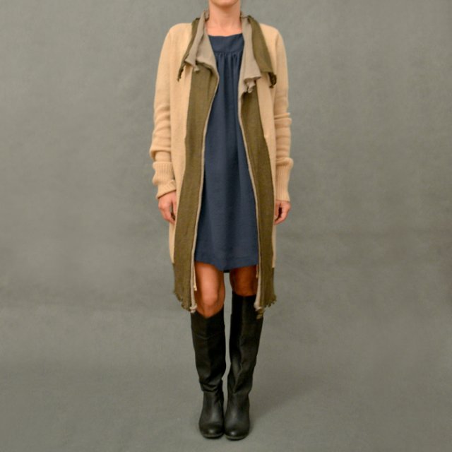 Świetny, dłuższy sweter w beżowym kolorze. Wykończony jaśniejszym i ciemniejszym khaki. Luźny kołnierz. Wiązany od środka na sznureczki. Polecam.
