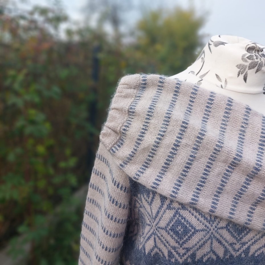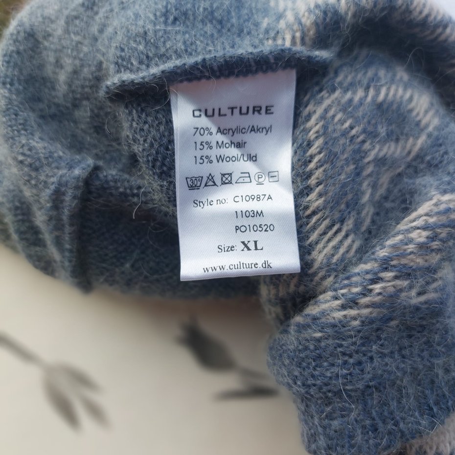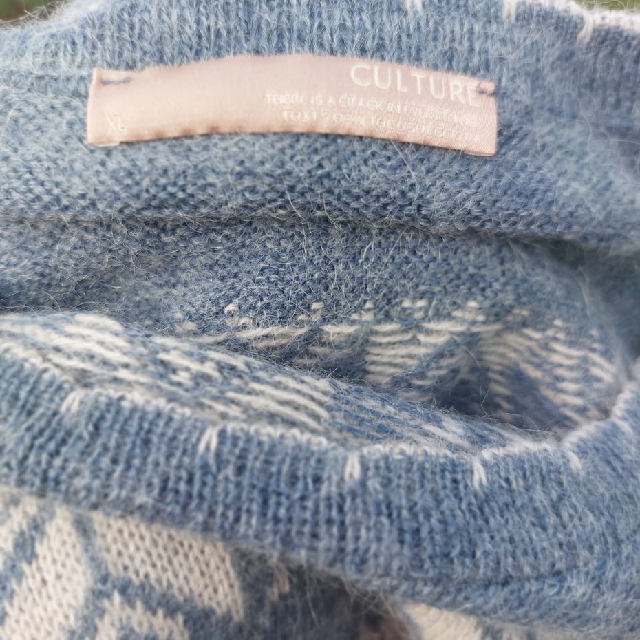 Dzianinowa sukienka marki Culture z akrylu, moheru i wełny w norweskie wzory. Owalny dekolt, rękawy u dołu lekko bufiaste , na brzegu rękawa gumka.
