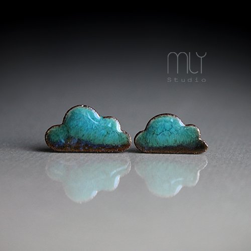 Oryginalne ceramiczne kolczyki w formie sztyftów, ręcznie wykonane z delikatnej śnieżnobiałej porcelany, jednostronnie szkliwione zielono błękitnym szkliwem z efektem drobnych plamek, na antyalergicznych sztyftach w kolorze srebrnym. Długość ok 17 i 15mm. Polecam