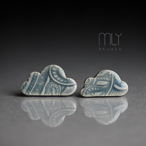 Oryginalne ceramiczne kolczyki w formie sztyftów, ręcznie wykonane z gliny kamionkowej, jednostronnie szkliwione mieszanką szarobłękitnych szkliw z efektem drobnych plamek, na antyalergicznych sztyftach w kolorze srebrnym. Długość ok 17 i 15mm. Polecam