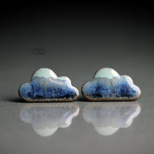 Oryginalne ceramiczne kolczyki w formie sztyftów, ręcznie wykonane z delikatnej kamionki, jednostronnie szkliwione błękitnym i szarym szkliwem z efektem drobnych plamek, na antyalergicznych sztyftach w kolorze srebrnym. Długość ok 17mm. Polecam