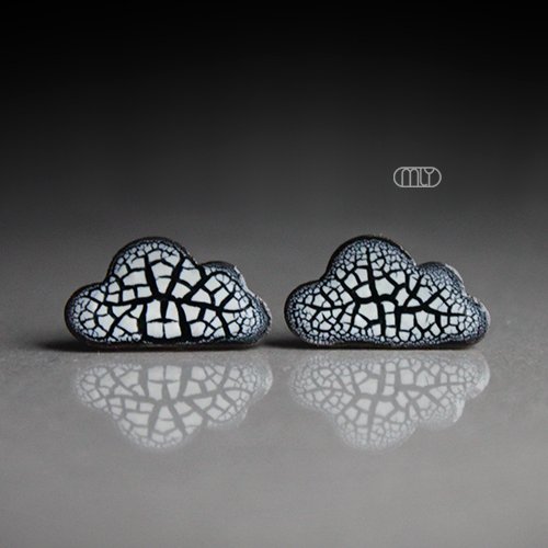 Oryginalne ceramiczne kolczyki w formie sztyftów, ręcznie wykonane z gliny kamionkowej, jednostronnie szkliwione mieszanką granatowo białych szkliw z efektem drobnych spękań, na antyalergicznych sztyftach w kolorze srebrnym. Długość ok 17mm. Polecam