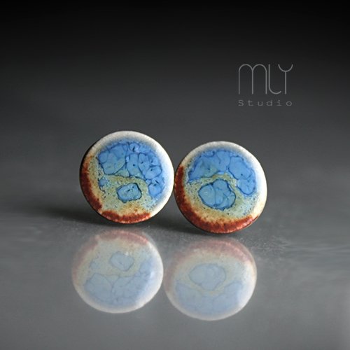 Ceramiczne okrągłe kolczyki w formie sztyftów, ręcznie wykonane z delikatnej gliny kamionkowej, jednostronnie szkliwione mieszanką błękitnych i żółtobrązowych szkliw z efektem plamek, na antyalergicznych sztyftach w kolorze srebrnym. Średnica ok. 9mm. Polecam
