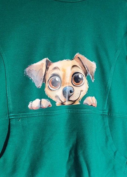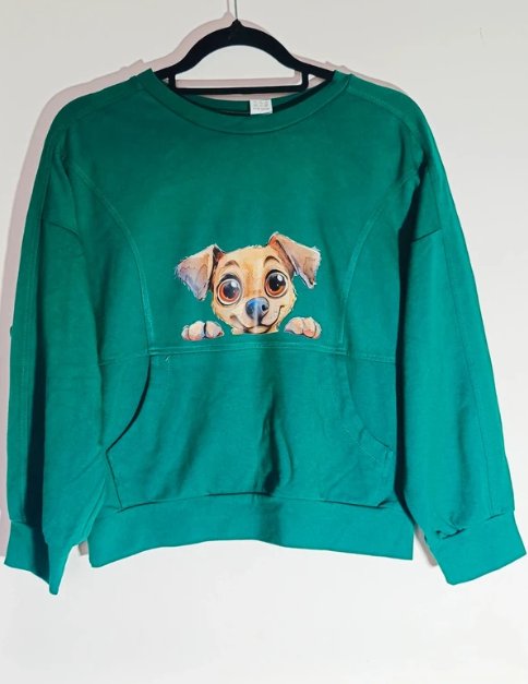 Bluza zielona (zdjęcie niestety nie oddaje intensywności koloru) z kieszenią kangurka rękawy 7/8, przeszycia.