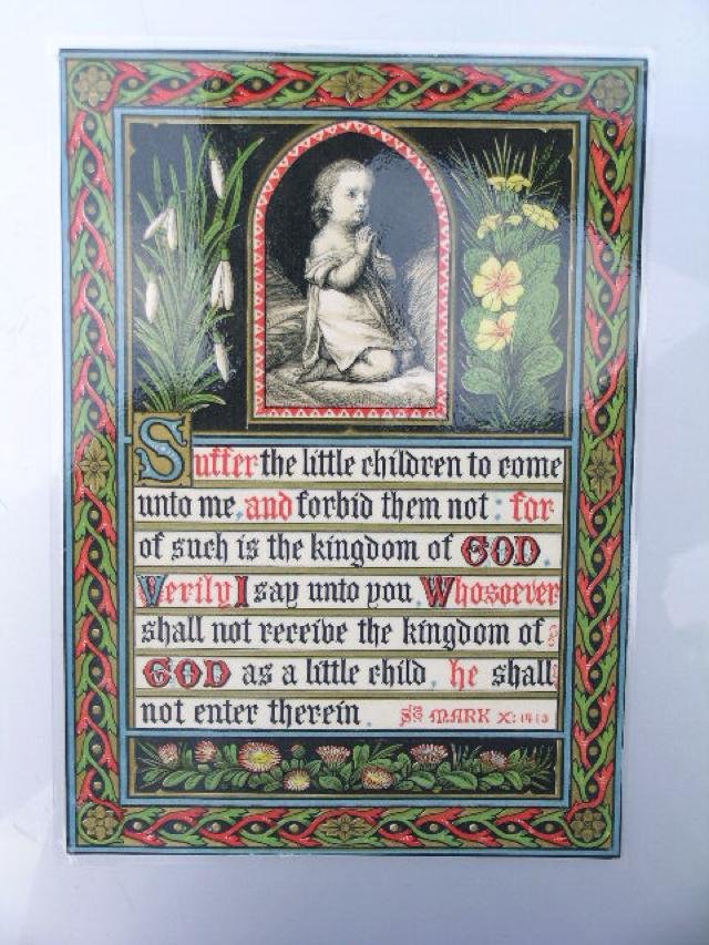 Dawnej daty wydruk z przypomnieniem duchowym. Bardzo dobra jakość i specyficzna bibliofilska estetyka, powtórzenie artystycznego drzeworytu lub grafiki sprzed lat. Porządnie obustronnie na błyszcząco zafoliowany (prześwietlenie barw to odbicie foliowanej powierzchni; sam wydruk w jakościowych, wyraźnych barwach). 22 x 15 cm. W rogach pojedyncze dziurki po pinezkach - ślady kształcącego stosowania :) Stan zachowania bardzo dobry minus.