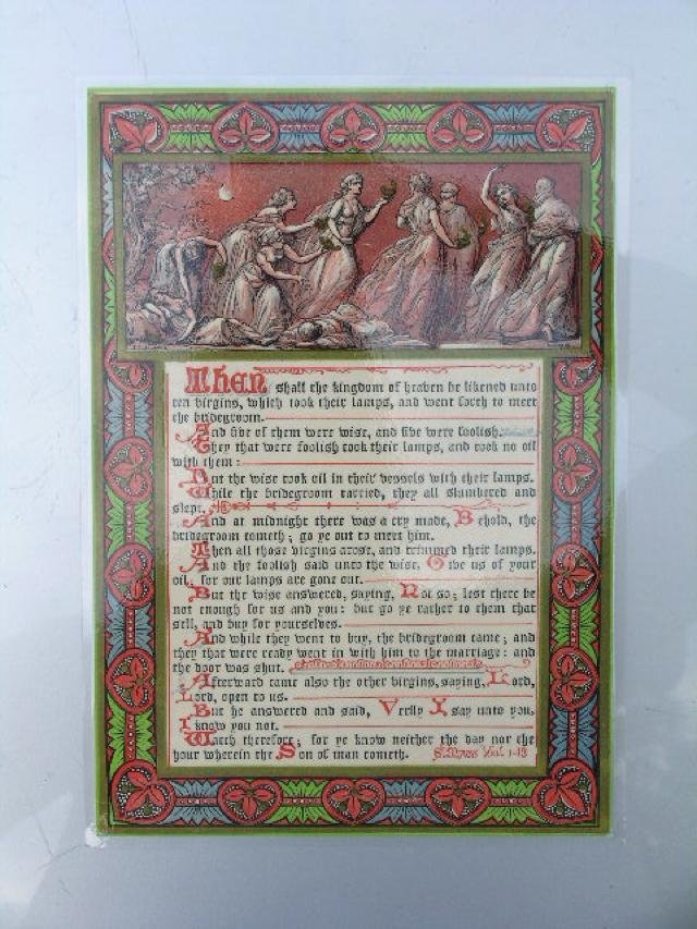 Dawnej daty wydruk z przypomnieniem duchowym. Bardzo dobra jakość i specyficzna bibliofilska estetyka, powtórzenie artystycznego drzeworytu lub grafiki sprzed lat. Porządnie obustronnie na błyszcząco zafoliowany (prześwietlenie barw to odbicie foliowanej powierzchni; sam wydruk w jakościowych, wyraźnych barwach). 22 x 15 cm. W rogach pojedyncze dziurki po pinezkach - ślady kształcącego stosowania :) Stan zachowania bardzo dobry minus.