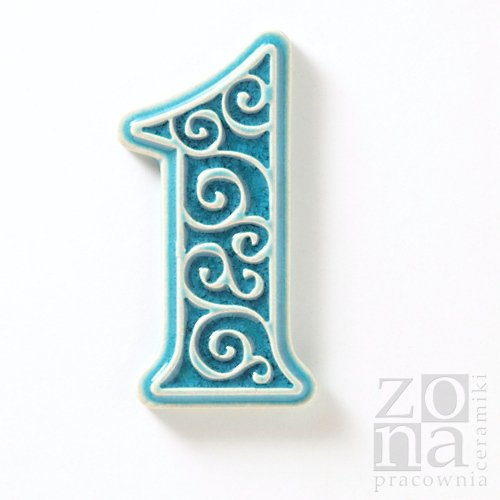 Ceramiczna cyfra 1 z ozdobnym ornamentem na drzwi mieszkania, domu. Wysokość 8cm, szerokość 4cm, grubość 7mm. Wykonana z jasnej gliny, pokryta błyszczącym, efektowym, czerwonym szkliwem, wypalona dwukrotnie w wysokiej temperaturze. Do montażu polecam jakiś szybkoschnący, uniwersalny klej montażowy do mocowania listew i paneli dekoracyjnych (może być np. SOUDAL 48A, 49A, 100A lub podobny). Oczywiście cyfry można przykleić też innym klejem, byleby spoina po wyschnięciu była trwała i odrobinę elastyczna. Cena dotyczy cyfry 1. Na zamówienie istnieje możliwość wykonania większej ilości podobnych. Polecam.