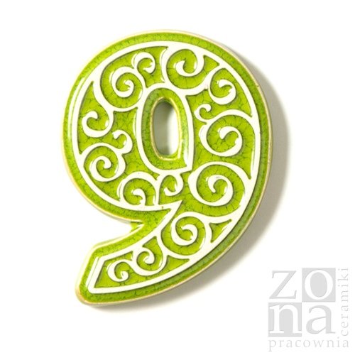 Ceramiczna cyfra 9 z ozdobnym ornamentem na drzwi mieszkania, domu. Wysokość 8cm, szerokość 6cm, grubość 7mm. Wykonana z jasnej gliny, pokryta błyszczącym, zielonym, efektowym szkliwem, wypalona dwukrotnie w wysokiej temperaturze. Do montażu polecam jakiś szybkoschnący, uniwersalny klej montażowy do mocowania listew i paneli dekoracyjnych (może być np. SOUDAL 48A, 49A, 100A lub podobny). Oczywiście cyfry można przykleić też innym klejem, byleby spoina po wyschnięciu była trwała i odrobinę elastyczna. Cena dotyczy cyfry 9. Na zamówienie istnieje możliwość wykonania większej ilości podobnych. Polecam.