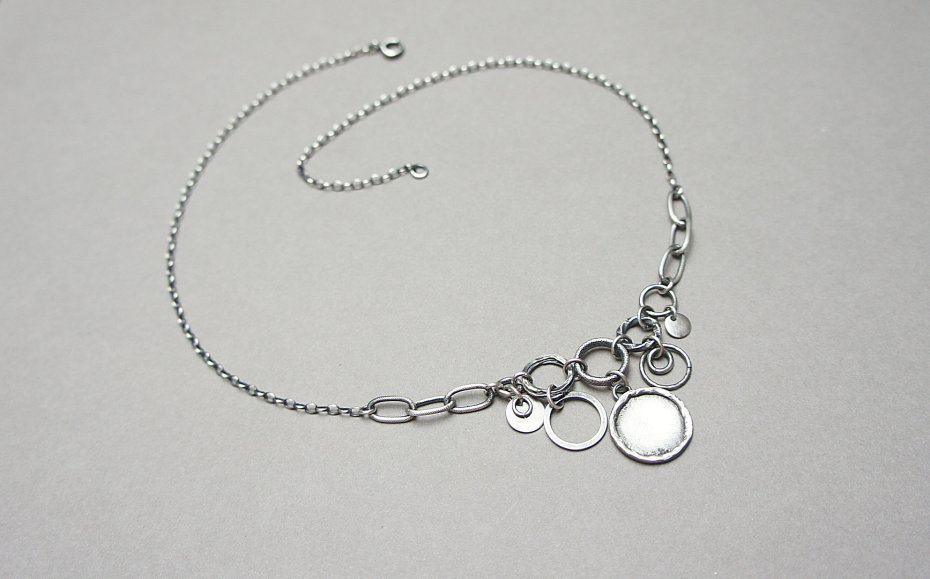 Naszyjnik wykonany ze srebra [pr. 925] w połączeniu z zawieszkami o surowej strukturze. Srebro oksydowane i przetarte. Całkowita długość łańcuszka około 44,5cm. Biżuteria ozdobnie zapakowana.