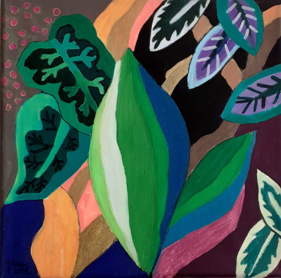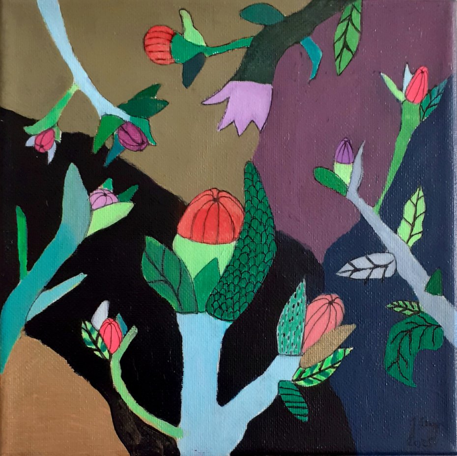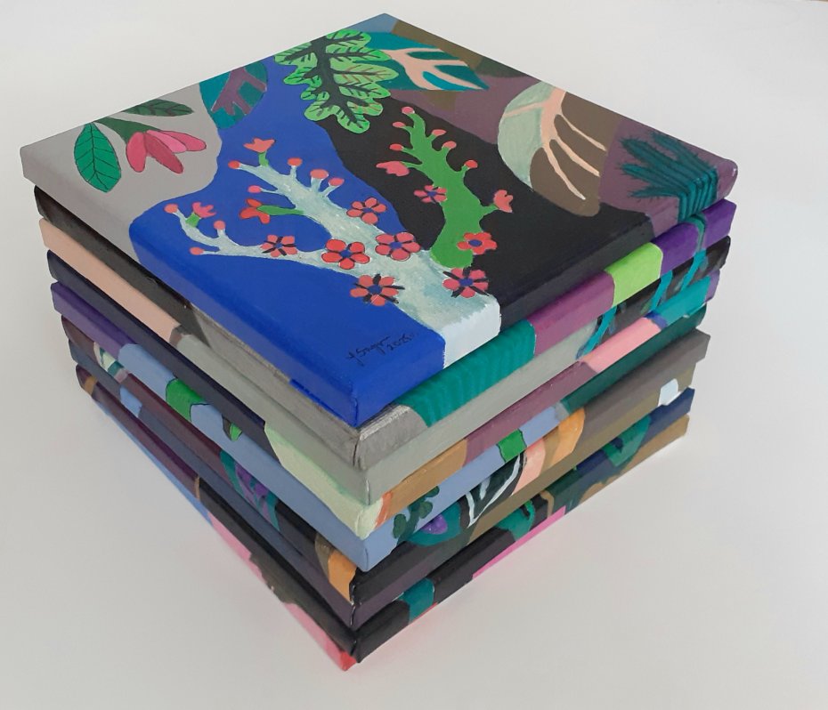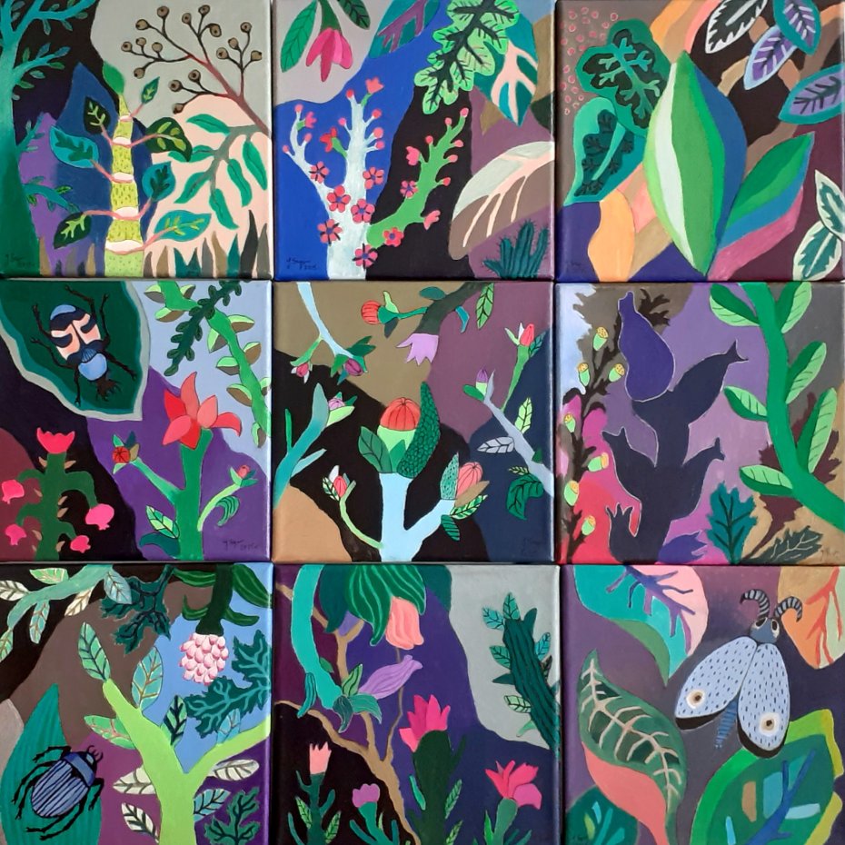 Zestaw 9 obrazów na płótnach o wymiarach 20x20cm do dowolnego ułożenia. Technika akrylowa. Motywy inspirowane światem przyrody, dzikich roślin i owadów.