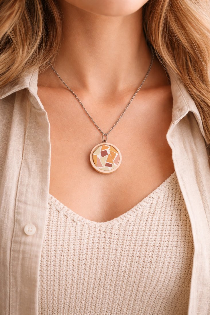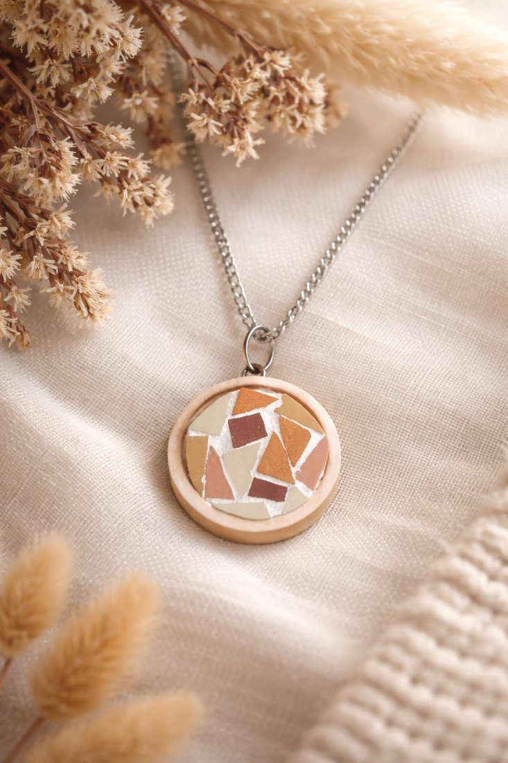 Drewniana zawieszka z gresową mozaiką w ciepłych kolorach, ręcznie wykonana. Srebrne lub złote wykończenie (do wyboru). Pięknie się prezentuje. Unikatowa biżuteria to idealny prezent dla ukochanej osoby, ale także oryginalna ozdoba dla samej siebie :)