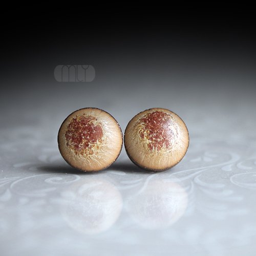 Ceramiczne okrągłe kolczyki w formie sztyftów, ręcznie wykonane z delikatnej czekoladowobrązowej gliny kamionkowej, jednostronnie szkliwione mieszanką beżowo brązowych szkliw z efektem plamek, na sztyftach w kolorze srebrnym. Średnica ok. 11mm. Polecam
