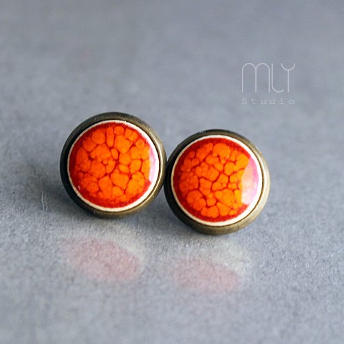 Okrągłe ceramiczne klipsy, ręcznie wykonane z delikatnej jasnobeżowej gliny kamionkowej, szkliwione pomarańczowym błyszczącym szkliwem, w oprawie w kolorze starego złota. Średnica elementu ceramicznego ok. 12mm. Polecam