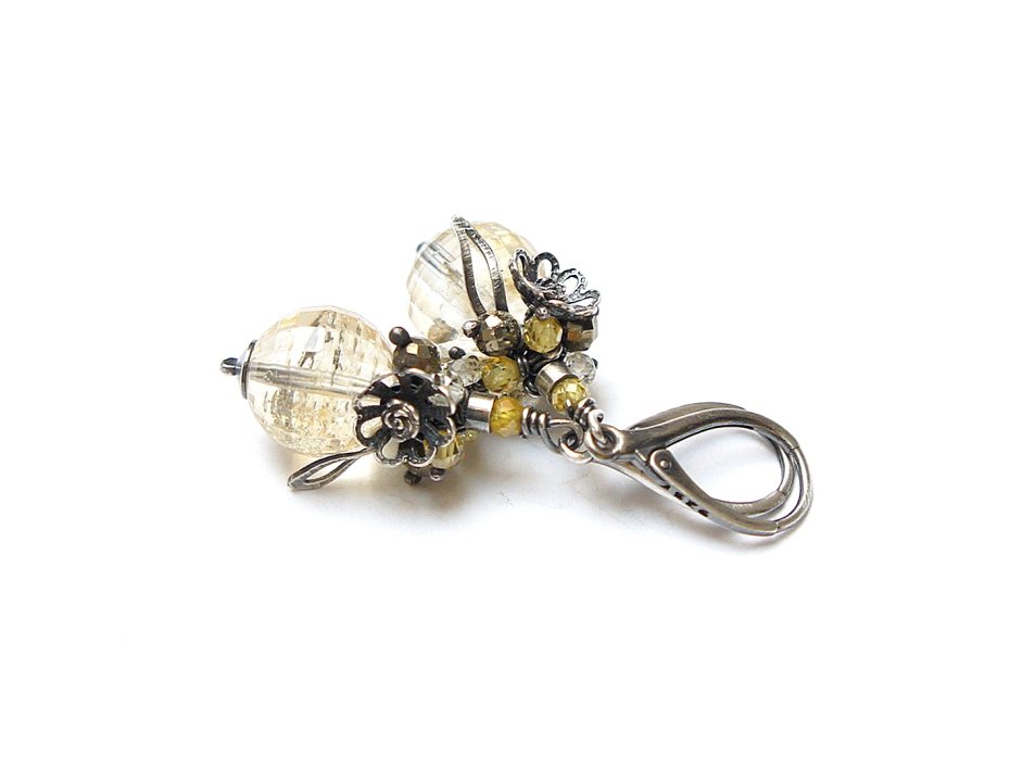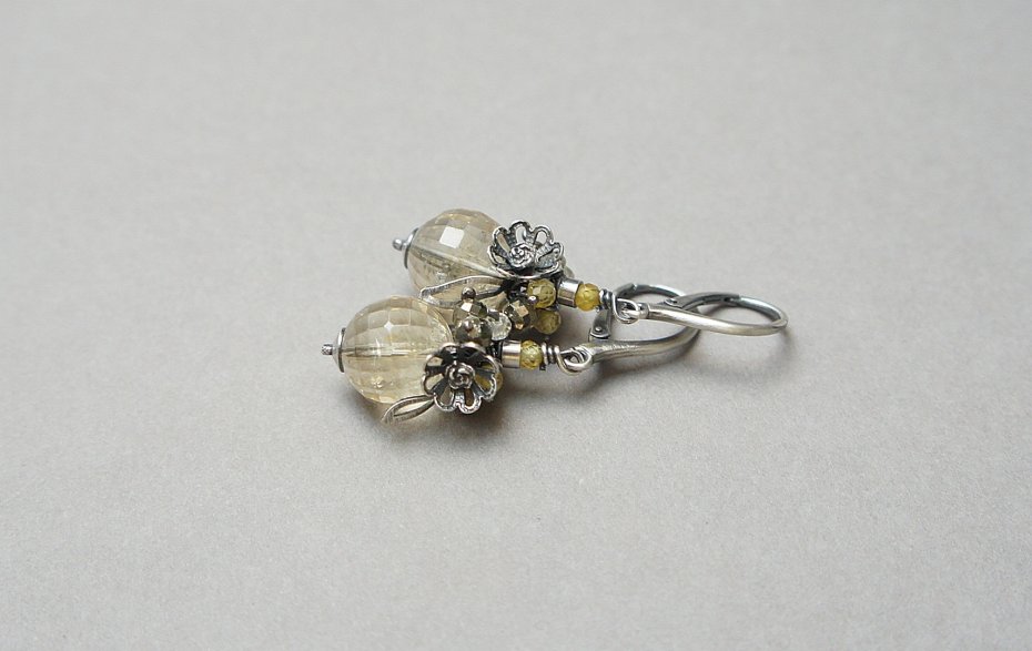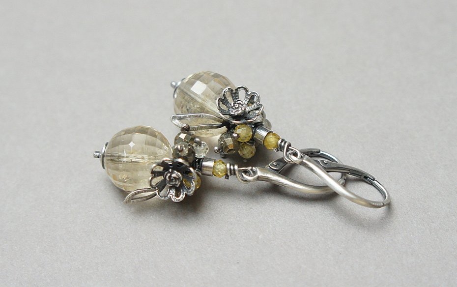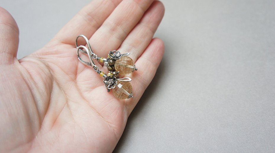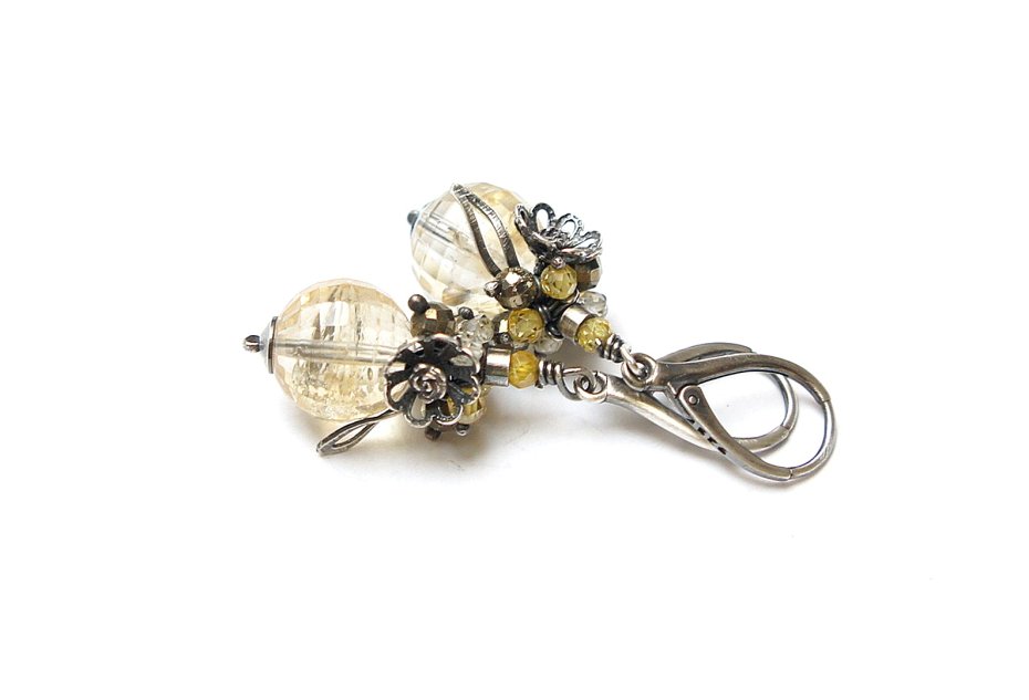 Kolczyki wykonane ze srebra [pr. 925] w połączeniu z wysokiej jakości fasetowanymi kuleczkami cytrynów [12mm klasa AA], fasetowanymi pirytami [4mm], cyrkoniami [3mm]. Całość oksydowana i przetarta. Całkowita długość kolczyków ok. 4,7cm. Biżuteria ozdobnie zapakowana.