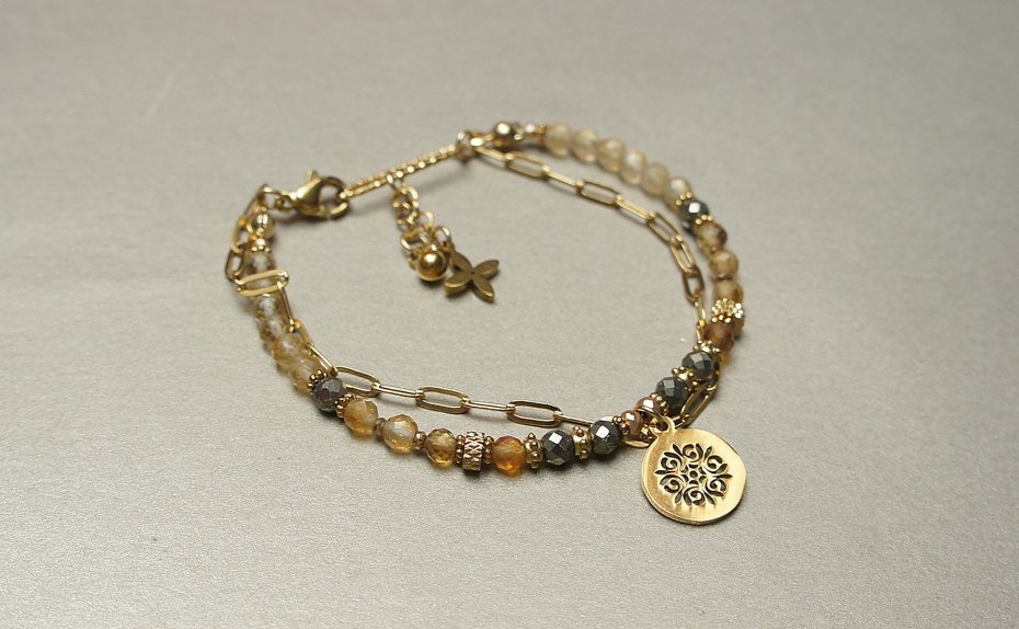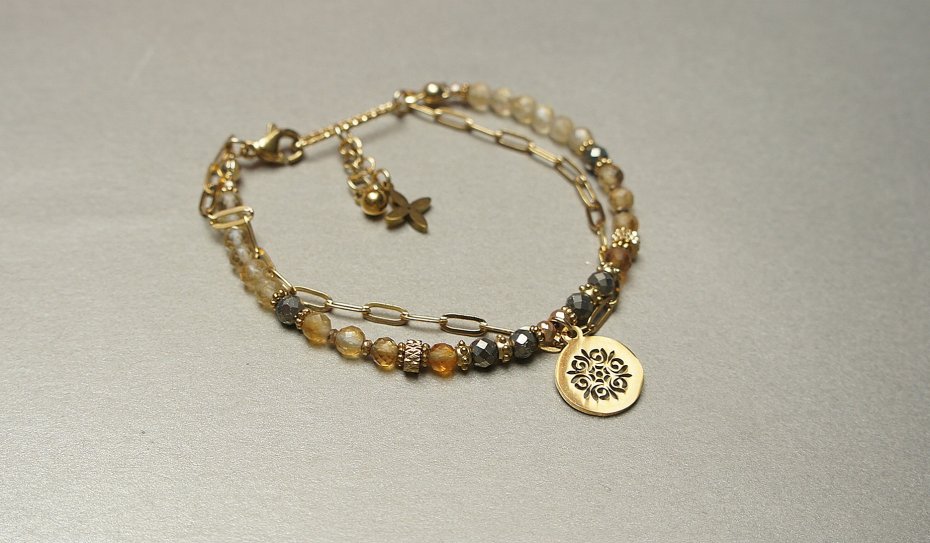 Delikatna bransoletka wykonana w całości ze stali szlachetnej pozłacanej, szlachetnych kamieni - cytryn fasetowany [4mm], piryt fasetowany [4mm], hematyt fasetowany, platerowany [3 x 2mm oraz 2mm],przekładek z hematytu [1mm]. Całkowita długość bransoletki ok. 18cm. Biżuteria ozdobnie zapakowana.