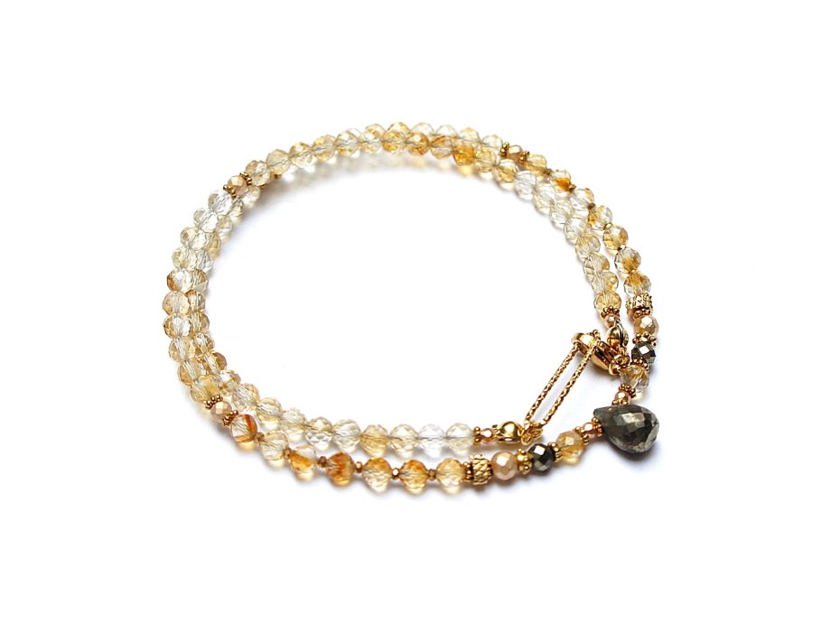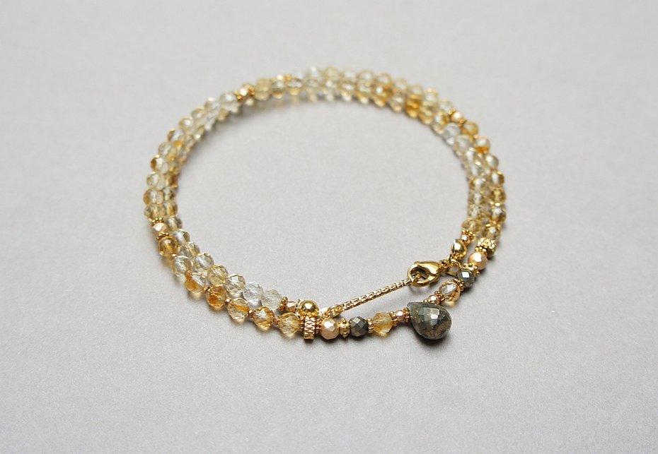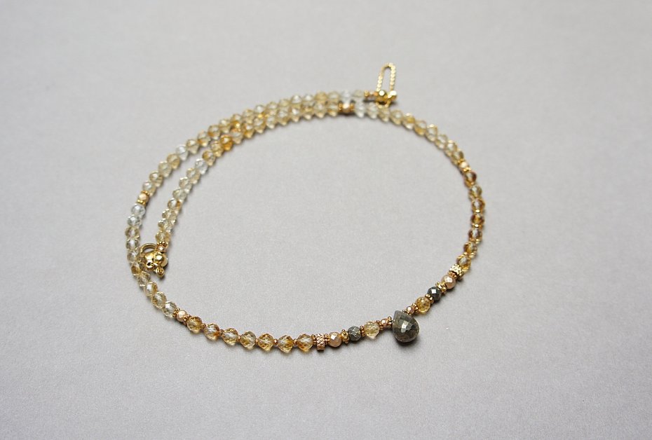 Krótki naszyjnik wykonany w całości z pozłacanej stali szlachetnej oraz naturalnych, szlachetnych kamieni - cytryn fasetowany [4mm], hematyt fasetowany, platerowany [4mm i 2mm], piryt fasetowany [4mm], przekładek z hematytu [1mm] oraz fasetowanej brioletki pirytu. Naszyjnik o długości ok. 42,5cm.