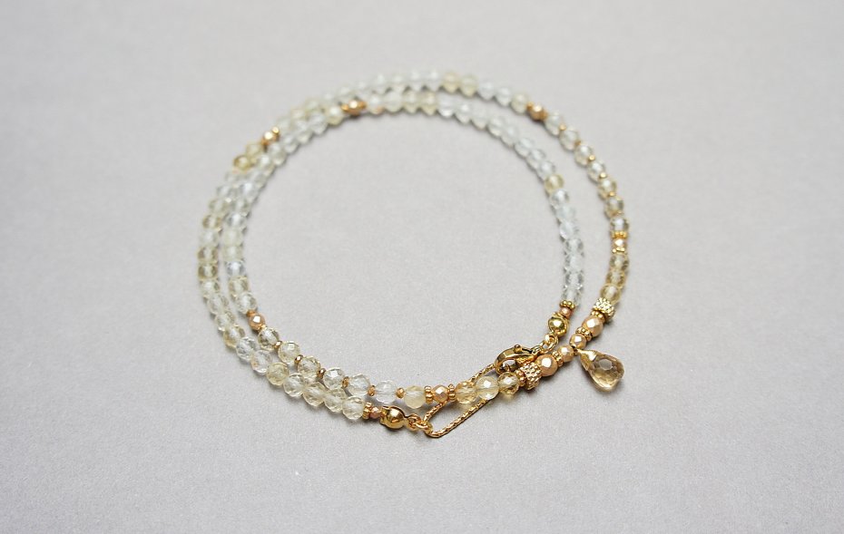 Krótki naszyjnik wykonany w całości z pozłacanej stali szlachetnej oraz naturalnych, szlachetnych kamieni - cytryn fasetowany [4mm], hematyt fasetowany, platerowany [4mm, 3mm i 2mm], przekładek z hematytu [1mm] oraz fasetowanej brioletki cytrynu. Naszyjnik o długości ok. 47,5cm.