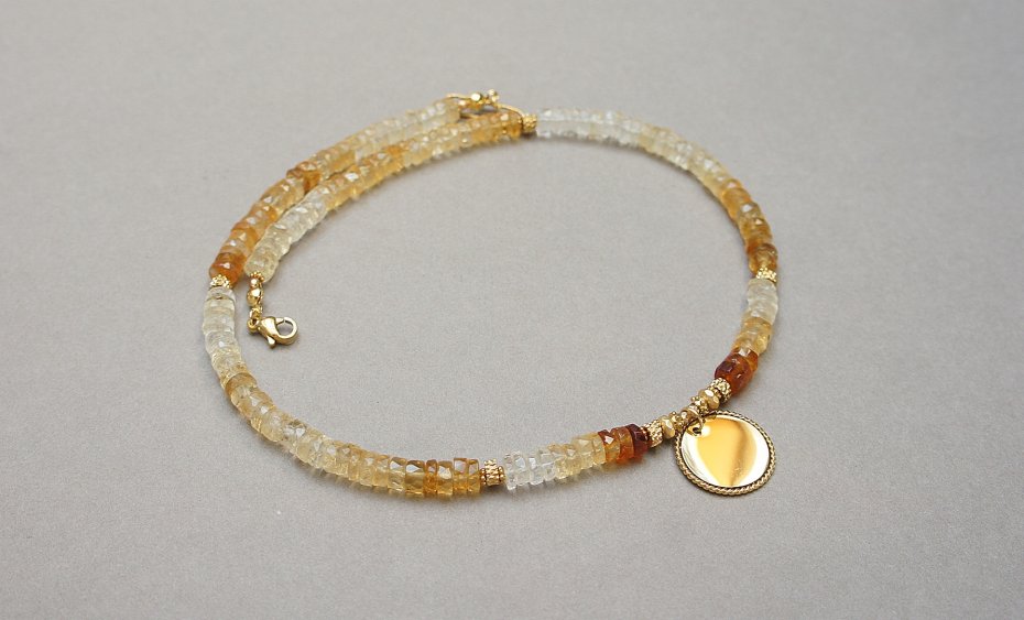 Krótki naszyjnik wykonany z pozłacanej stali szlachetnej oraz naturalnych kamieni - talarki nieregularnego, fasetowanego cytrynu wysokiej jakości [ok. 6 x 2mm], hematytu fasetowanego, platerowanego [4 x 2mm i 2mm]. Naszyjnik o długości ok. 43cm. Jedyny egzemplarz.