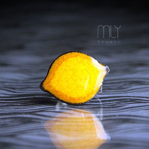 Oryginalna ceramiczna broszka, wykonana z delikatnej gliny kamionkowej, szkliwiona mieszanką żółtych szkliw z efektem plamek, zapięcie w kolorze srebrnym. Długość ok. 2,6cm. Polecam . Termin realizacji zamówienia to 1-2 dni..