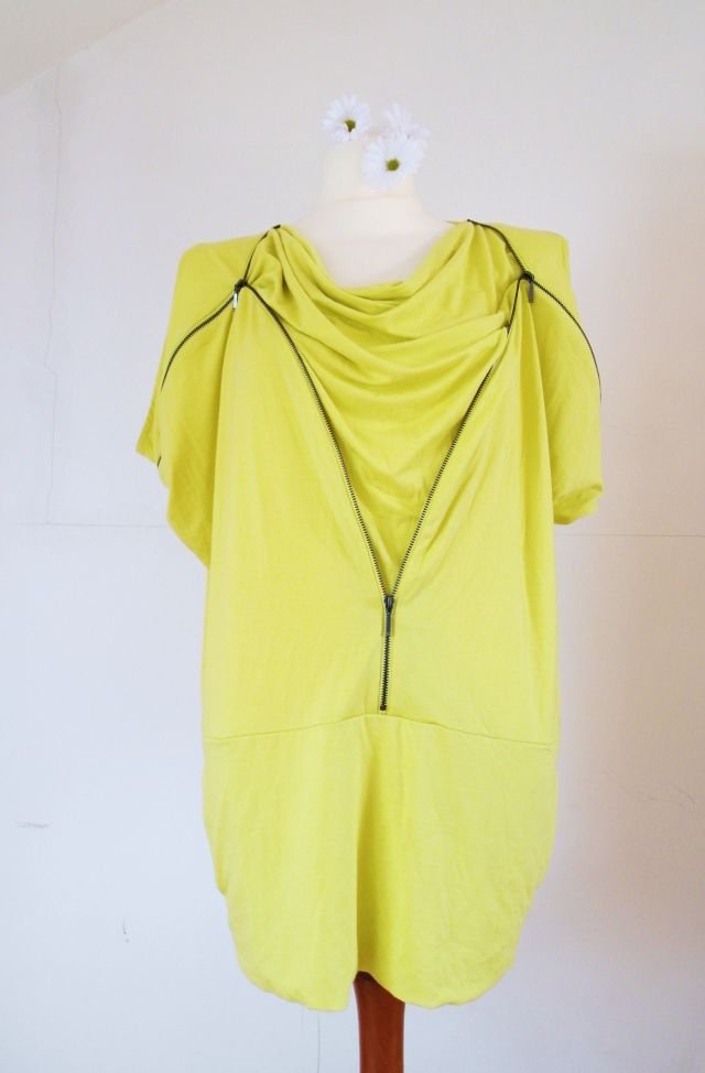 Pomysłowo wszyte suwaki - można regulować dowolnie dekolt oraz przód. Szeroki elastyczny pas u dołu, po bokach wsuwane kieszenie.