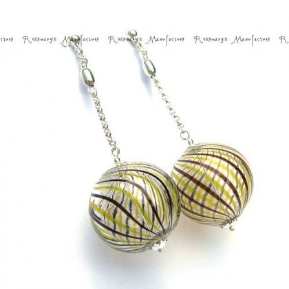 Urocze kolczyki ze szkła dmuchanego i srebra. Całkowita długość kolczyków wynosi ok. 5 cm.