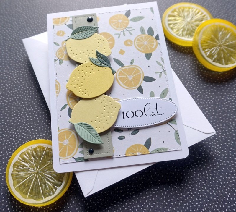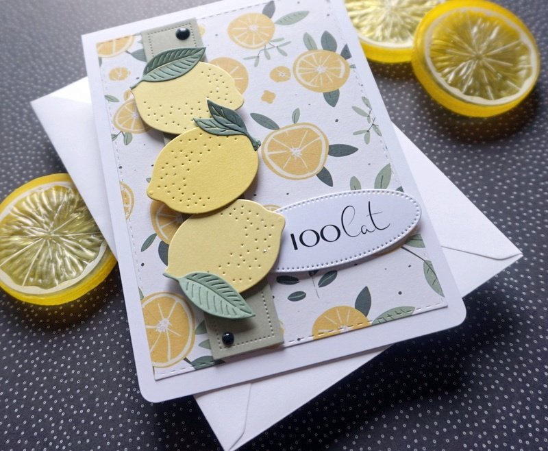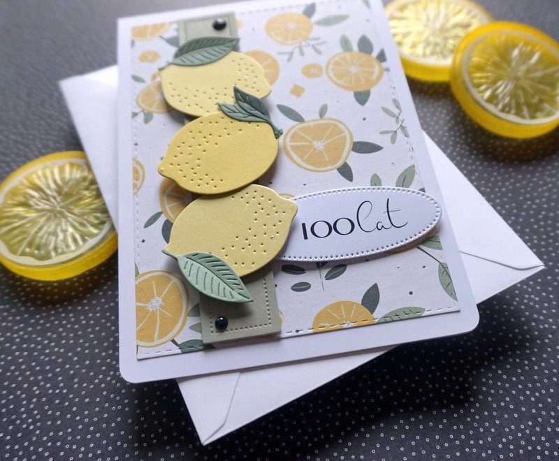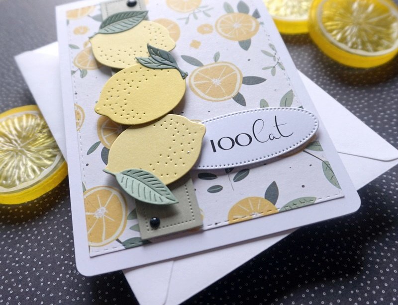 Część ozdobną kartki tworzy soczyście kwaśna, cytrynowa feeria barw. Wyjątkową misję kartki podkreśli napis umieszczony na tagu oraz... słodkie, odręczne słowa, którymi wypełnisz jej wnętrze. Kropkę nad "i" stawia przestrzenny charakter kompozycji.