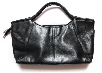 Czarna torebka, chyba skórzana (nie znam się na oryginalności tkanin skórzanych i skóropodobnych...), do ręki. Zapinana na suwak, wewnątrz 3 kieszonki (jedna na suwak, jedna na telefon). Z tyłu torebki również kieszonka na suwaczek. Dno sztywne 6,5 x 32 cm. Szer. torebki max 38 cm, wys. do zamknięcia 18 cm, wys. do rączek 21 cm, wys. max z rączkami 30 cm. Stan dobry, widać iż była użytkowana, kiedyś posiadała możliwość zaczepienia dłuższego paska, ale ostał się tylko jeden haczyk :(