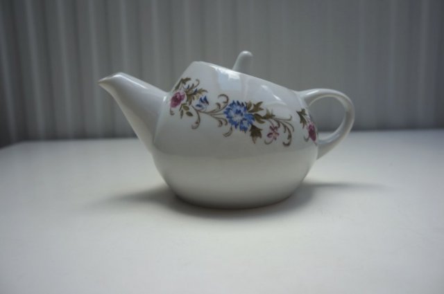 Porcelanowy czajniczek do parzenia herbaty. Przedmiot oryginalny, wyprodukowany w firmie Lubiana. Pochodzi z lat 70. XX w. Stan bardzo dobry.