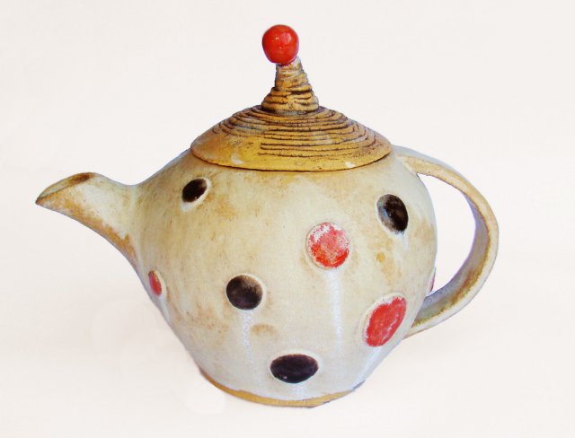 Witam. Oferuję czajnik do herbaty/kawy wykonany ręcznie, poszkliwiony białym szkliwem tzw. efektowym, dekorowany kołami szkliwionymi na kolory czerwony i czarny. Czajnik jest bardzo oryginalny, cienko lepiony przez co lekki i delikatny. Pojemność ok 1l.