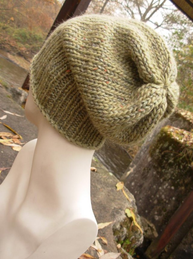 Czapa o krasnalowym fasonie. Ciekawy, wyszukany kolor - melanż zieleni (poszarzały odcień kiwi). Bardzo dobra gatunkowo włóczka, w składzie 75%wełny, 25% mohairu. Jest dosyć gruba, ciepła i mięsista. Rozmiar najlepiej na głowę o obwodzie ok 55-58cm, długość 30cm.