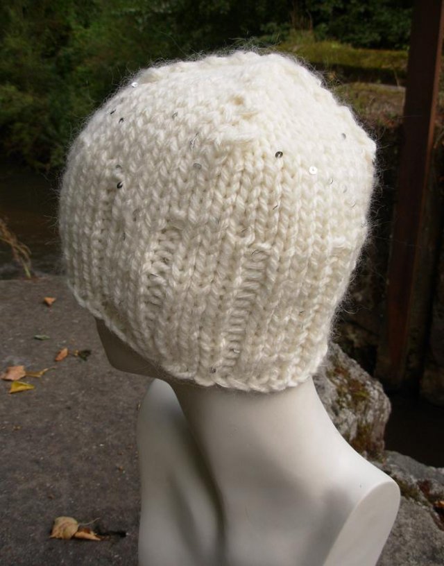 Grubaśna, fajna czapa o tradycyjnym fasonie. Kolor ecru / nakrapiana drobnymi złotymi cekinkami. Zrobiłam ją z mieszanki wełny, mohairu i akrylu. Świetnie układa się na głowie. Najlepiej będzie pasowała na głowę o obwodzie ok 56-58cm, głębokość 22,5cm.