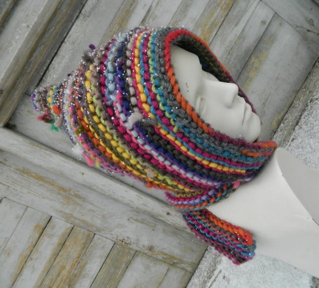 Czapa o wyjątkowo twarzowym fasonie, taki tybetański kapturek, lapoński elf - naprawdę świetna. Mega kolorowa, grubaśna, na zwariowaną głowę :). Wydziergałam ją ze świetnej gatunkowo setki wełny (wełna 100%). Supełki łączenia włóczek celowo widoczne na prawej stronie. Jest mięsista, ciepła i jak na wełnę setkę przyjemna w kontakcie ze skórą. Rozmiarowo najlepiej na głowę o obwodzie ok 55-57cm.