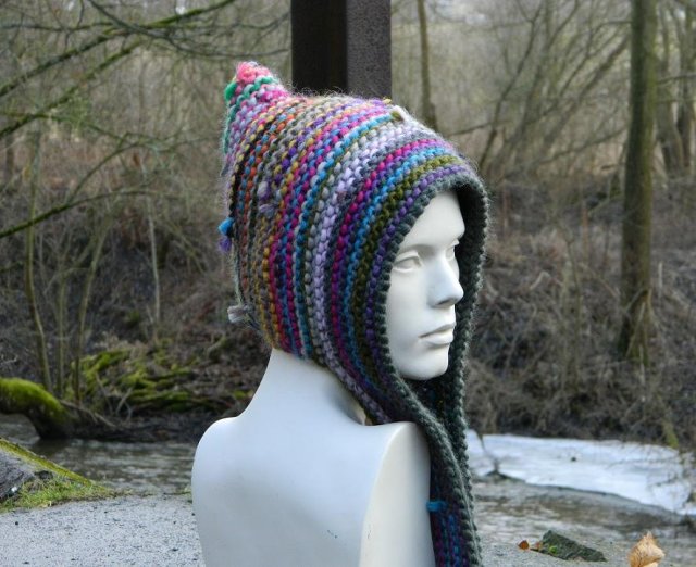 Czapa o wyjątkowo twarzowym fasonie, taki tybetański kapturek, lapoński elf - naprawdę świetna. Mega kolorowa, grubaśna, na zwariowaną głowę :). Wydziergałam ją ze świetnej gatunkowo setki wełny (wełna 100%). Supełki łączenia włóczek celowo widoczne na prawej stronie. Jest mięsista, ciepła i jak na wełnę setkę przyjemna w kontakcie ze skórą. Rozmiarowo najlepiej na głowę o obwodzie ok 54-57cm.