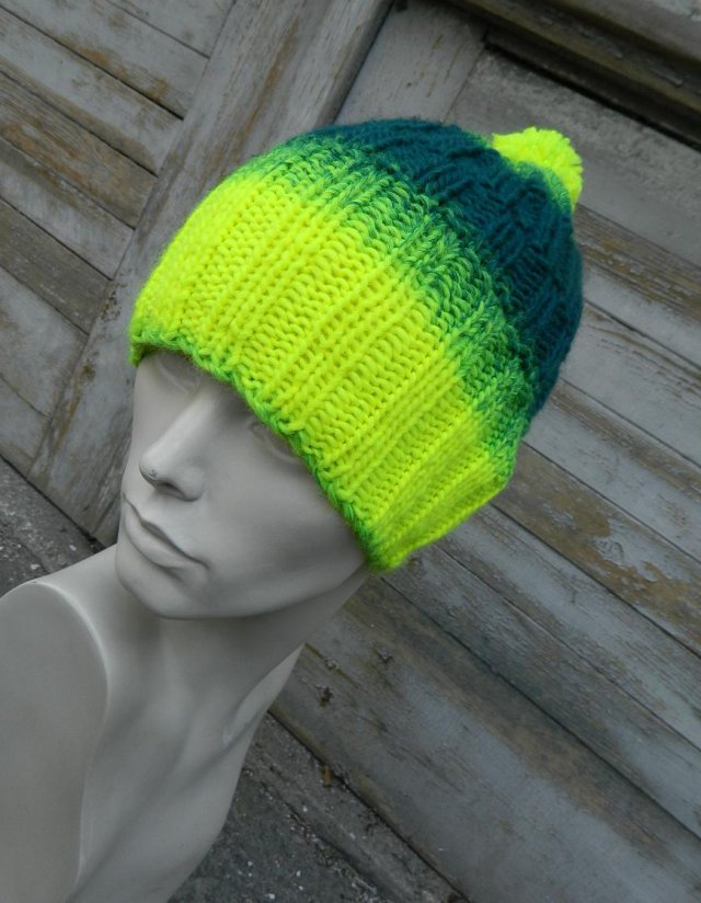 Średniej grubości czapka (jesienna lub na cieplejszy zimowy dzień) z małym pomponikiem. Wydziergałam ją z holenderskiej włóczki, mieszanka wełny 30% i akrylu 70%. Jest sprężysta i przyjemna w dotyku, dobrze układa się na głowie.
