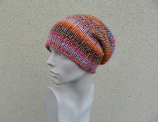 Czapkę ręcznie wydziergałam na drutach z melanżowej dobrej gatunkowo włóczki (35% wełny, 65% akrylu). Jest średniej grubości (niezbyt gruba, ale też nie cienka), mięsista, bardzo przyjemna w kontakcie ze skórą. Formować można ją w dowolny sposób, wg upodobania (krasnal, kokon, wywijana). Najlepiej będzie pasowała na głowę o obwodzie ok 54-56cm, głębokość 30cm.