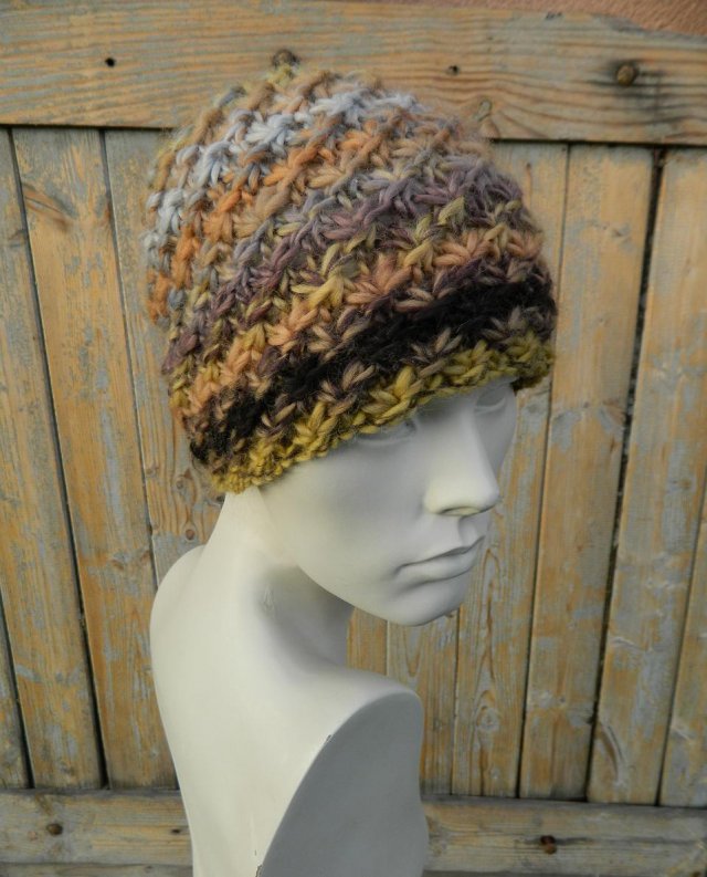 Czapkę ręcznie wydziergałam na drutach z melanżowej dobrej gatunkowo włóczki (60% wełny i 40% akrylu). Jest średniej grubości (jesienna), mięsista, bardzo przyjemna w dotyku . Bardzo zgrabnie, równiutko układa się na głowie. Obwód ok 55-57cm, głębokość 21cm.