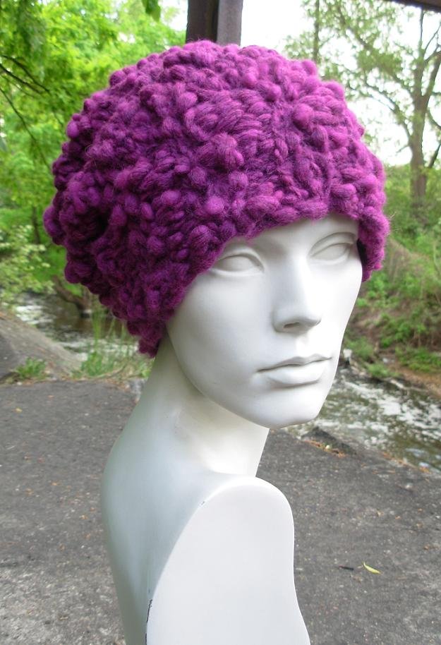 Świetna, ogromniasta (dużo jej na głowie) czapa w stylu HIPSTERSKIM :). Jest grubaśna, ciepła, mięsista i bardzo przyjemna w dotyku. Kolor to mocna, świetlista fuksja. Efekciarska guzowata włóczka o składzie: 74% wełna, 17% akryl, 9% polyamid. Formować można ją w dowolny sposób, wg upodobania (trzeba znaleźć sobie na nią swój sposób), można nosić na prawej lub lewej stronie. Obwód uniwersalny, najlepiej ok 56-59cm, głębokość 32cm..